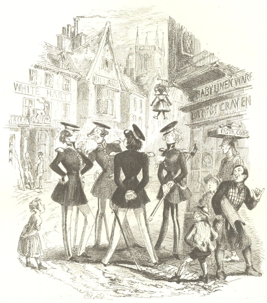 But he walks on, thinking of nothing less than blood and slaughter; and now he comes in sight of three other military young gentlemen, arm-in-arm, who are bearing down towards him, clanking their iron heels on the pavement, and clashing their swords with a noise, which should cause all peaceful men to quail at heart. They stop to talk. See how the flaxen-haired young gentleman with the weak legs—he who has his pocket-handkerchief thrust into the breast of his coat-glares upon the fainthearted civilians who linger to look upon his glory; how the next young gentleman elevates his head in the air, and majestically places his arms a-kimbo, while the third stands with his legs very wide apart, and clasps his hands behind him. Well may we inquire—not in familiar jest, but in respectful earnest—if you call that nothing. Oh! if some encroaching foreign power—the Emperor of Russia, for instance, or any of those deep fellows, could only see those military young gentlemen as they move on together towards the billiard-room over the way, wouldn’t he tremble a little!