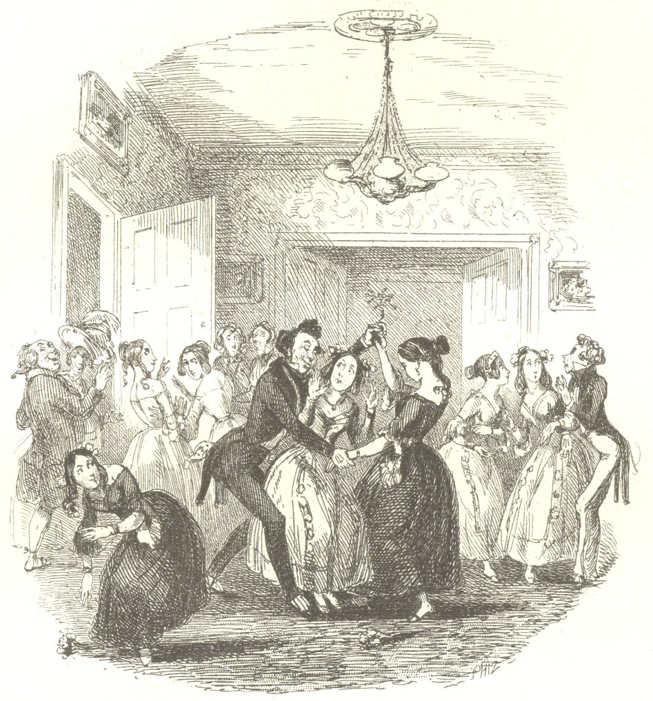 When the round game and several games at blind man’s buff which followed it were all over, and we were going down to supper, the inexhaustible Mr. Griggins produced a small sprig of mistletoe from his waistcoat pocket, and commenced a general kissing of the assembled females, which occasioned great commotion and much excitement. We observed that several young gentlemen—including the young gentleman with the pale countenance—were greatly scandalised at this indecorous proceeding, and talked very big among themselves in corners; and we observed too, that several young ladies when remonstrated with by the aforesaid young gentlemen, called each other to witness how they had struggled, and protested vehemently that it was very rude, and that they were surprised at Mrs. Brown’s allowing it, and that they couldn’t bear it, and had no patience with such impertinence. But such is the gentle and forgiving nature of woman, that although we looked very narrowly for it, we could not detect the slightest harshness in the subsequent treatment of Mr. Griggins. Indeed, upon the whole, it struck us that among the ladies he seemed rather more popular than before!