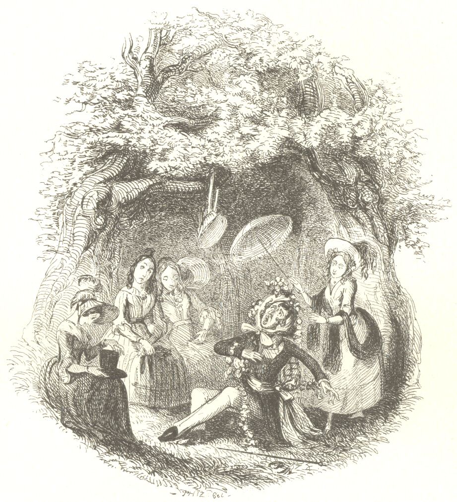 The young ladies’ young gentleman was seated upon the ground, at the feet of a few young ladies who were reclining on a bank; he was so profusely decked with scarfs, ribands, flowers, and other pretty spoils, that he looked like a lamb—or perhaps a calf would be a better simile—adorned for the sacrifice. One young lady supported a parasol over his interesting head, another held his hat, and a third his neck-cloth, which in romantic fashion he had thrown off; the young gentleman himself, with his hand upon his breast, and his face moulded into an expression of the most honeyed sweetness, was warbling forth some choice specimens of vocal music in praise of female loveliness, in a style so exquisitely perfect, that we burst into an involuntary shout of laughter, and made a hasty retreat.