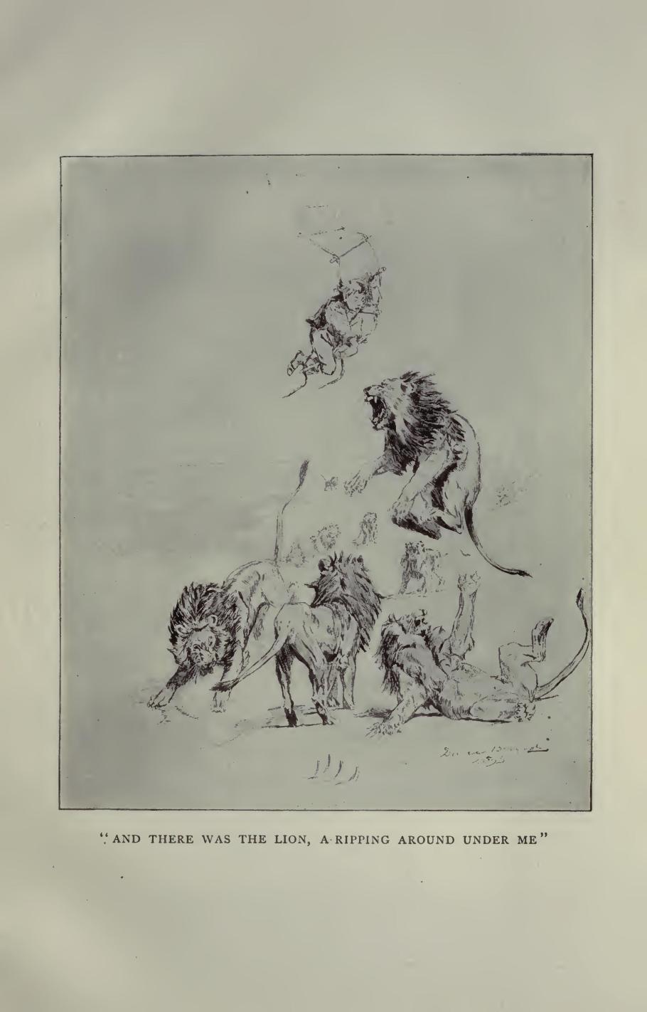 At last I took up the glass and see some little black things a-capering around on that velvet carpet, and some more a-climbing up the cretur’s back, and then I see two or three wee puffs of white smoke, and told Tom to look. He done it, and says:
