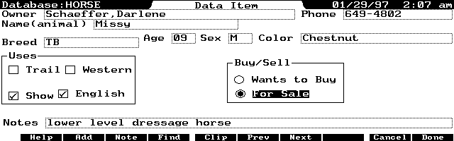 When conversing with my clients, I often hear of horses for sale or of their purchasing interests. Until I created a horse database in my palmtop, I would forget details once I left the farm. Now I can quickly answer clients questions in that regard pretty easily, using the Database search function. (See Screen 2 on page 22.)