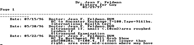 DVM software holds my medical history records for each animal I examine. When I have finished with one animal, I merely close its history and go on to the next. This process can be accomplished from the "transaction screen," so when all of an owner's animals have been examined and treated, I know the cost.