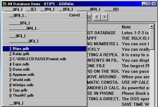 GDBWin is a program for Windows (9x/NT/2000) that lets you access GDB, NDB, and PDB files created on the HP 100/200LX. It doesn't work with Appointment Book or World Time files. The program will let you view and edit information in the database files. It will let you add or delete category words and subsets. However it will not let you create or modify a database. You must create custom databases on the Palmtop (or in CPack) before they can be accessed with GDBWin. As a result the program is of use only to owners of the HP 100/200LX Palmtops.