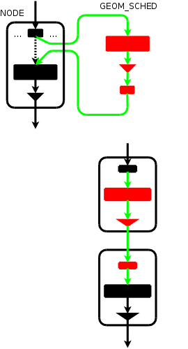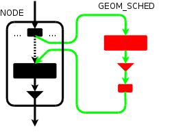 BEFORE ---> [ pp --> old_gp ...] A normal "geom sched create ad0" call would create a new geom node on top of provider ad0/pp, and export a newly created provider ("ad0.sched." accessible through pointer newpp). AFTER create ---> [ newpp --> gp --> cp ] ---> [ pp --> old_gp ... ] On top of newpp, a whole tree will be created automatically, and we can e.g. mount partitions on /dev/ad0.sched.s1d, and those requests will go through the scheduler, whereas any partition mounted on the pre-existing device entries will not go through the scheduler. With the transparent insert mechanism, the original provider "ad0" is hooked to the newly created geom, as follows: AFTER insert ---> [ pp --> gp --> cp ] ---> [ newpp --> old_gp ... ] so anything that was previously using provider pp will now have the requests routed through the scheduler node.