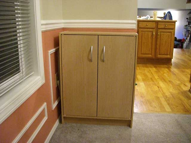 - I know it's hard sometimes, but your cabinet may be different than mine, so you'll want to be fully aware of the sequence of assembly and where all the parts are going BEFORE you start screwing things on. Without any hardware involved, I made sure that my power strip would have plenty of room on all sides so that there wouldn't be any problem assembling the cabinet. My original idea had the strip in the back of the side, but after seeing where the peg holes for the shelves are, and thinking about how some wall warts might need to be turned around, I decided to put the strip right in the middle of the side. You might need to choose a different location as well.