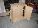 - Before you nail on the backing for your cabinet, figure out where the power strip cord will be exiting the back of the cabinet, and take a notch out of the backing piece. For my cabinet, it was just a heavy piece of cardboard with wood print on one side. All I needed was a pair of heavy scissors to cut a piece out of the bottom corner nearest the power strip cord.