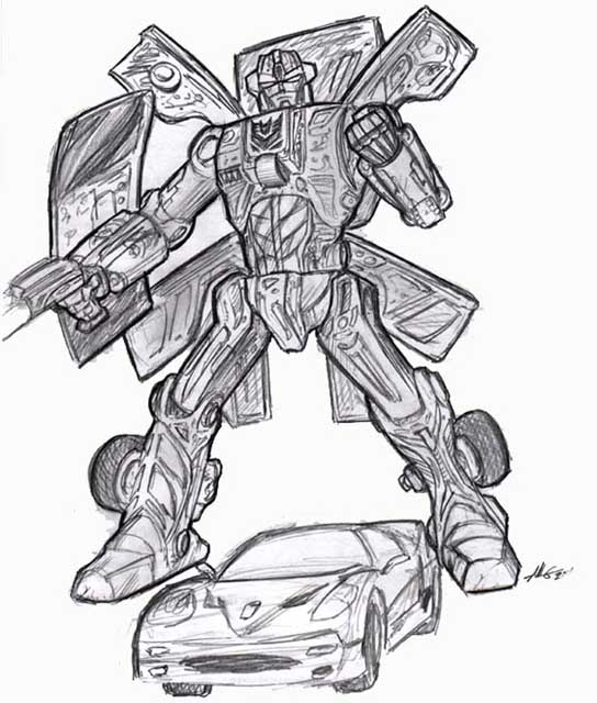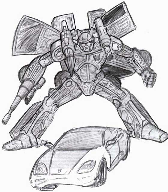 - "Road Warp" - Pencil, drawn circa 2000? Reminiscent to Skywarp, Road Warp has tried to follow in his predecesor's footsteps . . . just on the road. He has the ability to warp small distances to outmanuver his prey. (64k, 7-31-04)