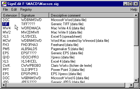 For example, in the above table, we have two different extensions (DOC and MCW) for the WDBNMSWD signature string. The MCW extension is used by Word for the files converted to the Word Mac format. This item is also used only in the direction PC to Mac. Below, we find another signature (W6BNMSWD) for the same DOC extension. This is the signature for Word 6 for the Mac.