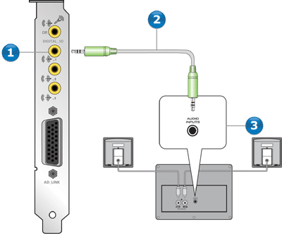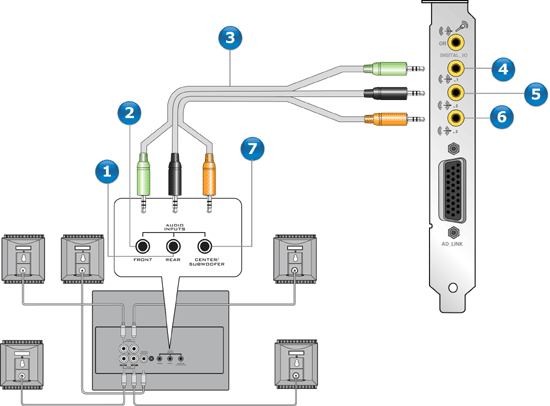 Sie können analoge Lautsprechersysteme für bis zu 7.1-Kanäle anschließen. Weitere Informationen zur Verwendung der richtigen Buchsen finden Sie unter Darstellung Stereobuchse und vierpolige Buchse.