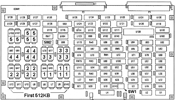 with up to five memory modules of 512KB each installed. The second through