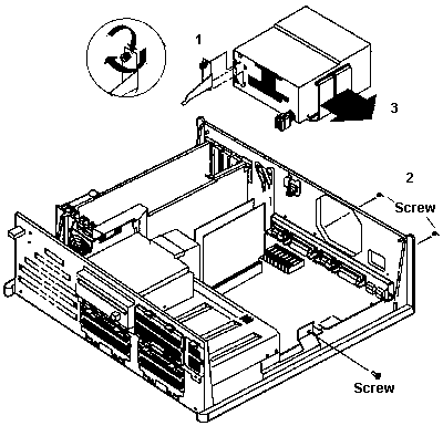Remove Model 90 PSU ![]() Unscrew the captive screw on the power-supply support leg. Pull the top of the support away from the PSU and continue rotating it forward until the support is free of the bottom clips on the PSU. Now pull the support towards the rear of the system until the front tip can be pulled from the drive shelf. Now unscrew the three standard screws from the PSU. Unplug the planar power supply sockets from the board and pull the PSU out. Opening the 9590