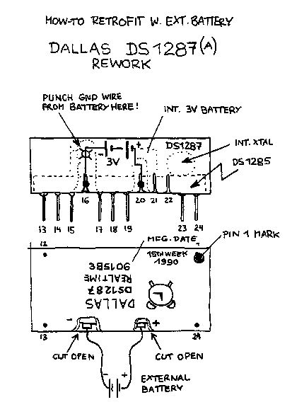 Peter of Lemgo spake thusly: You have either a PS/2 25-286, 30-286, 55 or 65 which comes up with a "165 configuration error" and fail to keep the setup once been shut off again. Well - these have the dreaded Dallas DS1287 "all in one" Real Time Clock (RTC) chip with integrated Xtal and battery. Now the battery is dead, configuration is lost after relatively short time again and you get error-codes constantly. A really new, fresh and unused chip is hard to get. Even its successor DS12887 is pretty hard to get and darn expensive. At that point you wish you could add an external battery. But you can't. There are no provisions for one. Not yet. The Action: Have a look at the graphics below. Basically the DS1287 is a DS1285 chip, where the pins for the xtal-connection and the battery are bent upwards. Then the battery and xtal are placed atop of the chip, connected to the pins and everything is covered with a pretty rigid protective compound. ![]() What you need to do: * use a Dremel or a metal saw to cut at pin 16 vertically down to the metal pin surface * repeat the procedure at pin 20 * scratch off the sealing compound around the pins, particularly at Pin 16 towards the top * use a watchmaker screwdriver or a nail to break the connection to battery minus over pin 16 NOTE: Don't be afraid: this chip is really hard to damage. If you have a multimeter test the voltage on pins 16 and 20 before and after. Before it may read anything from some 100mV up to 3V (where you should ask yourself *why* you wish to modify this chip ...?) and after it must be 0 (zero) latest after 5 seconds of measuring. When you get a 0V-reading, you have successfully disconnected the battery.