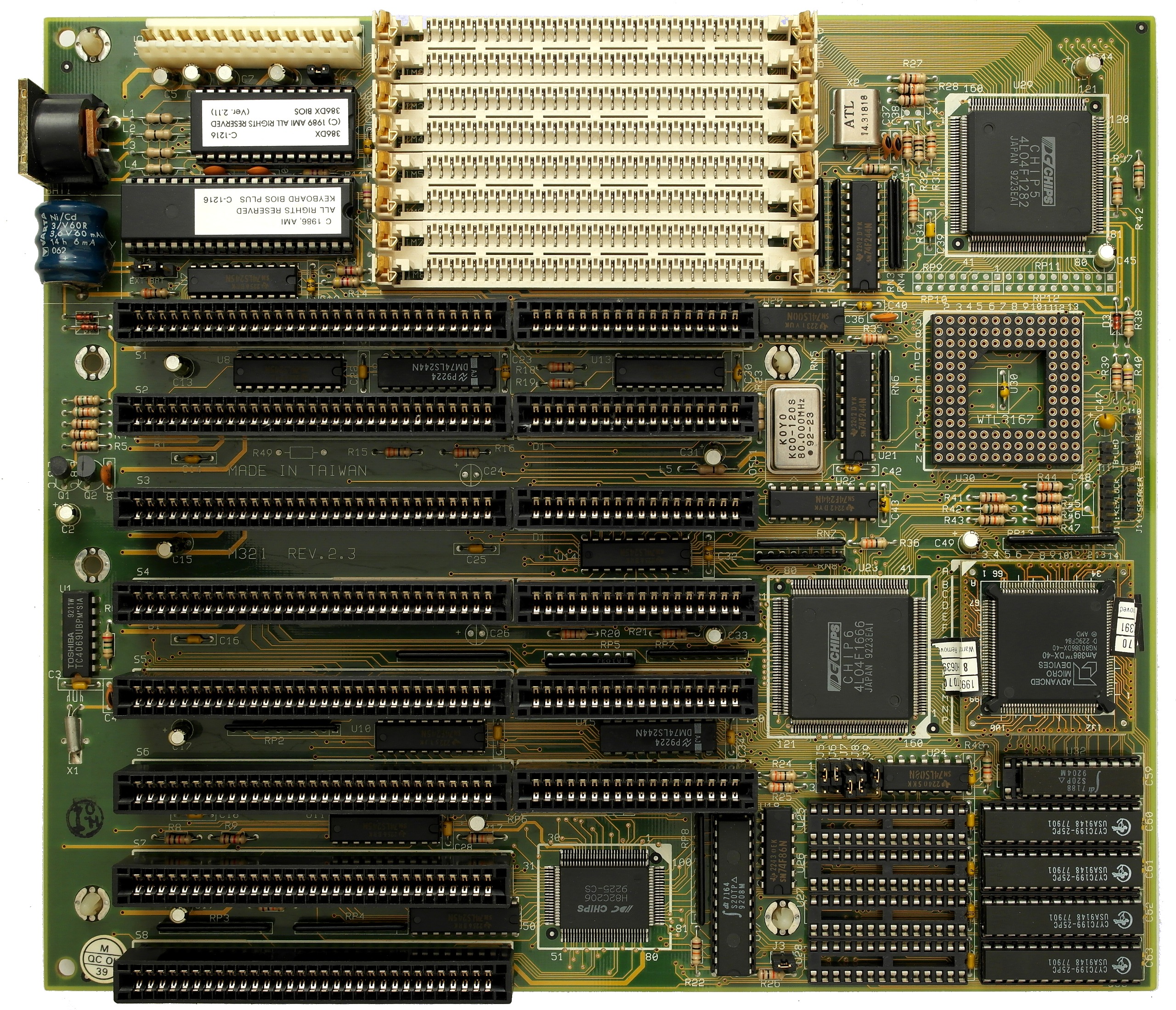 Comments | 1. Motherboard is marked "ECS-386/32" 2. User manual is here 3. From the user manual: "The ECS-386/32 a 80386-based mainboard" 4. From the user manual: "Chips & Technologies CS8230 chip set" 5. BIOS consists of an L chip and an H chip (low and high) |