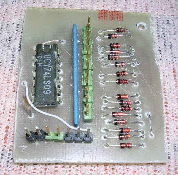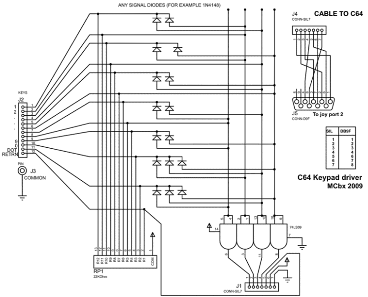 OK, Finally, here is the schematic diagram of the keypad driver. It's quite self-explanatory, the last open-collector stage is realized using 74LS09 quad AND gates IC. It MUST be 74LS09, because there's a limited load we can draw from C64's joystick port. RP1 is a 12x20KOhm resistor pack, you can use any value from 15K to 47K. Diodes are a typical signal diodes, in my case 1N4148. Keypad's key wires are connected to J2, J3 is its common ground. C64 cable goes from J1 (SIL) as shown in the table and ends with female DB-9 connector (DB9F). Its pin numbers should be OK, as they're etched on the connector's plastic part.