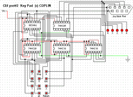 Many years ago, N. Coplin released a circuit and a software program to attach a homemade numeric keypad to Commodore 64. The archive containing schematic and software driver can be downloaded HERE. Schematic diagram of this device is shown in the picture on the right. It's a very difficult thing... You can get scared of logic gates and lots of connections between them. To make these chips work, an extrenal power supply is also needed. It's probably possible to build it on a veroboard, but using a normal PCB it will require at least 2 layers of copper to connect every piece of logic. But if we look further into this thing, we'll see that's only a binary encoder. We can make it simplier. To make the keypad working, loading a special software "driver", included in archive, is needed. Writing special "drivers" may make this device work in other 8-bit computers.