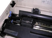 Another 9-dot matrix printer from mid-1990s, this unit is from 1994-95. Although Epson units were usually rich in methods to push the paper through unit, this unit allows only to print on separate sheets or continuous paper fed from the rear. However, LX300 can print very quietly, quieter than other printers from its age.