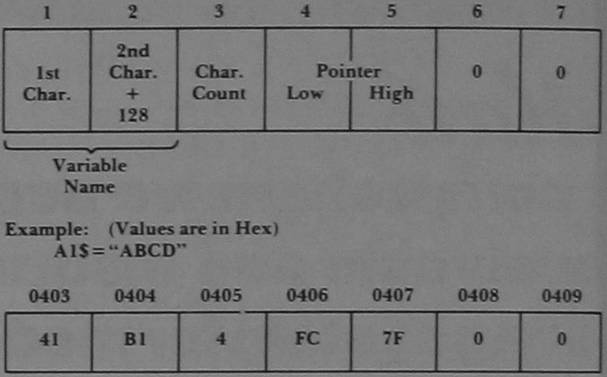 Strings are stored at the top of the available memory. As each string is entered, it is added to the bottom of the list. In order to identify a particular string we must know where it begins and how long it is. The PET uses one byte to represent the length of the string, and two bytes to identify the address where the string begins. The particular format that identifies a string depends on whether the string is an element of an array or a simple variable.