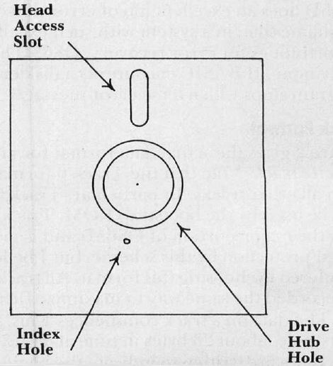 The typical diskette looks as in Figure 1. A magnetically coated round piece of plastic is enclosed in a protective cardboard envelope which has an inner, slippery plastic liner. The hub of the disk drive engages the large hole in the middle of the plastic diskette causing it to spin very rapidly inside its envelope. There is a long slot in the envelope enabling the head of the drive to make contact with the plastic diskette.