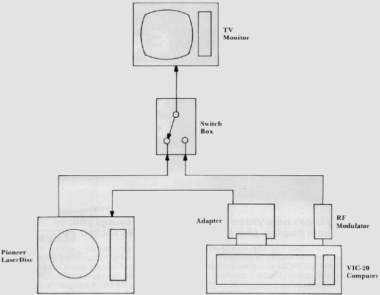 It is straightforward to interface the VIC-20 to the Pioneer, VP1000 LaserDisc player. A block diagram of the VIC Intelligent Video Disc System is shown in Figure 1. The switch box shown in Figure 1 allows the use of a single TV monitor for the VIC and the Pioneer player. The switch box contains RF connectors for the computer, disc, and TV. We used the inexpensive Type F connectors.