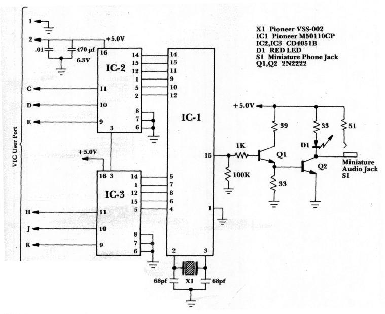 Figure 1: VIC's Intelligent Video Disc SystemThe CD4051s are switched by the output from the 6522 VIA chip in the VIC computer by way of the User Port terminals C thru K. The transistors Q1 and Q2 buffer IC-1, provide pulse inversion and drive for the 30 feet of audio cable connected to the LaserDisc player. The LED, D1, also blinks out the coded pulse string indicating that the data pulse chains are being sent by the Adapter.
