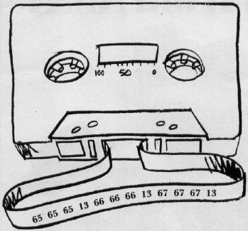 In any case, after this program is RUN, the magnetic memory would contain a file. If we could look at that file on the tape the way we would look at a photograph, we would see a row of numbers. The number 65 stands for the letter A and 13 represents a carriage return. Here's what the photograph would look like: