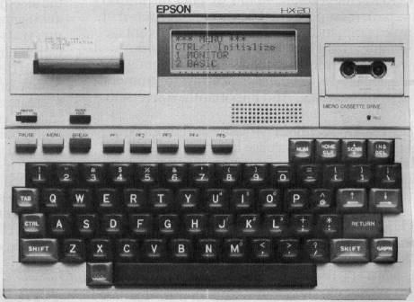 Epson, the well-known printer manufacturer, introduced a 16K portable computer with a suggested retail of $795. The computer is truly portable, deriving power from four NiCad batteries. Built-in (standard) features include a LCD (Liquid Crystal Display) screen with 20 character by four line display, and a 24 column dot matrix printer. The entire unit measures roughly 11 inches by 8.5 inches by 2 inches, and weighs 3 pounds, 13 ounces. The unit also features a built-in RS-232C communications port with full/half duplex selection and 110 to 4800 baud rate. A standard microcassette unit is optional.