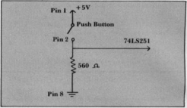 Figure 1. Push ButtonPin 1 again supplies + 5 volts through the connecting wires to one end of a 150,000 ohm variable resistor. The other end of the resistor is connected through the wires to pin 6. Turning the game control varies the resistance between the 5 volt supply voltage and pin 6 on the game I/O connector. When the resistor is turned so the resistance in the circuit is large, very little current can flow back to pin 6. A low resistance setting of the game control allows a large current to flow back to pin 6.