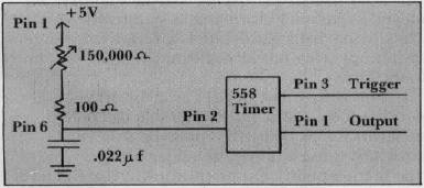 The timing cycle is started when the 558 is triggered – accomplished by PEEKing at location 49264 (-16272 or $C070). After the 558 is triggered, the output goes high, and the capacitor is allowed to charge up from the current through the game controller. When the capacitor reaches 2/3 of the supply voltage, the output goes low and remains low until triggered again. The 558 then automatically discharges the capacitor and waits for another trigger. Memory location $C064 is high (greater than 128) while the output of the 558 timer is high, and low (less than 128) when the output of the timer is low. How a high output from the 558 affects the value in a memory location is a good topic for some other author.