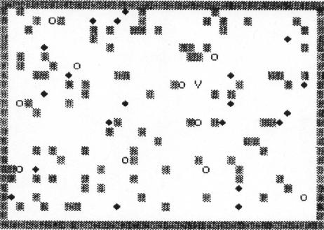 You then face a new screen of pods and robots, but each new level challenges you with two additional robots. You know you're really good (but in big trouble) when you have 15 or more robots to deal with. The game can handle up to 64 robots, but it is inconceivable that anyone could withstand the "Laser Barrage" that long. (But if you're superhuman and manage to, you can change lines 1640 and 1650, memory permitting.)
