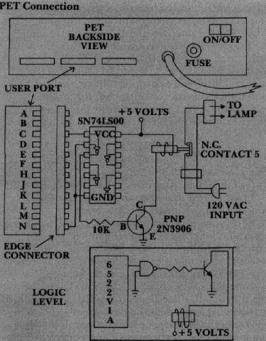Our simple demonstration interface could control a lamp to provide home security or just to show off the versatility of your PET. You will need a NAND gate (SN74LS00), a 5 volt DC power supply, a NPN transistor, a SPST relay, a 10K resistor, and some means of bringing it all together.