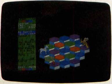 Hex is a colorful and deceptively simple game. Your goal is to change the 19 hexagonal blocks of the arena to green before your opponent—controlled by the computer—can turn them to purple. All it takes to change a block's color is to jump on it with your onscreen character. Each block changes color in a sequence displayed at the start of each level: green, then red, then purple, and finally blue before the sequence repeats. Seemingly a simple enough task.