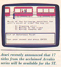 Atari recently announced a marketing agreement with Montreal-based Arrakis, publisher of the Advantage series of educational software. ST versions of these programs, which have in the past been available for Apple, Commodore, and IBM, should be ready by the end of the year. The Arrakis series is known for its impressive graphics and cartoon-like animation, as well as a sophisticated parser which incorporates principles of artificial intelligence and provides direct answers to students' questions.