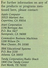 Nevertheless, tremendous changes have occurred in teachers attitudes toward microcomputers over the last couple of years. There are several reasons. First, software publishers have increasingly attempted to provide the kind of programs that teachers feel comfortable with—quantifiable, curriculum based software. At the same time innovative, nontraditional kinds of learning aids have gained a wider acceptance. Second, the hardware and software shakeouts that have moved the computer industry toward maturity and greater stability have made educators feel more confident about making a financial commitment to microcomputers. Finally, teachers are generally less anxious about computers and more experienced at applying them, with a growing number of classroom success stories fueling increased computer use. It's not just the students and a few computer-wise teachers who are driving the movement anymore.
