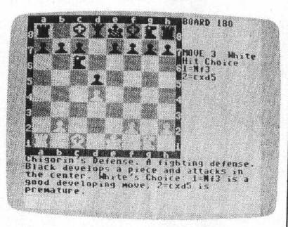 At any time, with any board on the screen, you can invite the Coffeehouse Chess Monster to play out the board. You can choose which side you want to play. In fact, you can even ask the Monster to play both sides while you watch. The chess program has nine levels of play, and uses the standard algebraic notation system—as does the tutorial program.