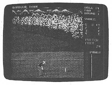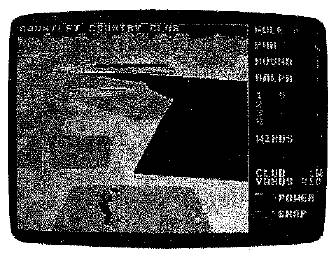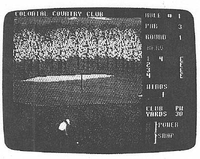 The golfer figure itself is also worth mentioning. Full-figured, the golfer is an integral part of the game. You measure his backswing and follow through in two ways. The first, obviously, is by watching the animated figure; the second way is by watching sidebars that gauge power, snap, and distance. These sidebars work in sync with the golfer to produce all shots taken during the course of play. Incidentally, all choices and actions can be controlled through a joystick or the keyboard.