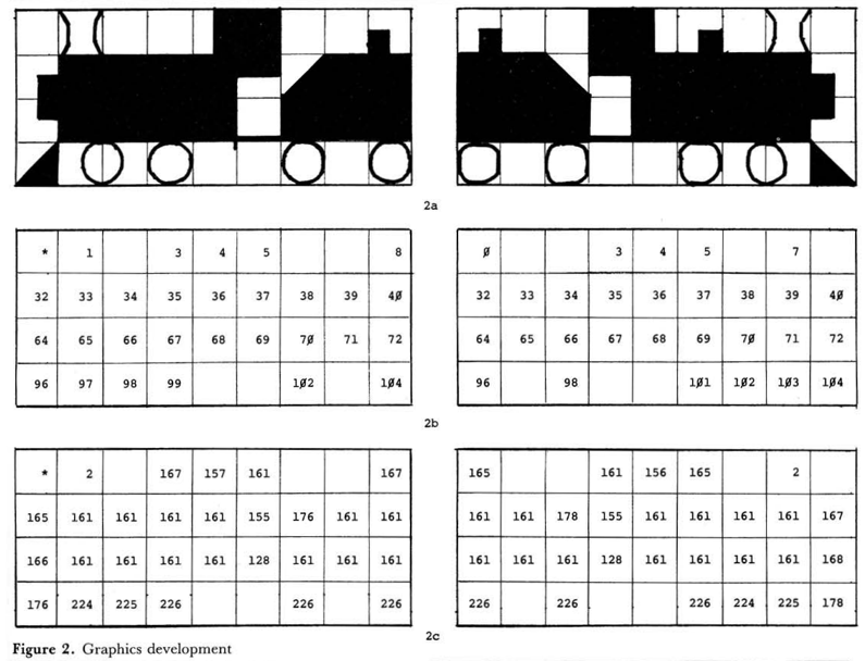 The screen image is developed by following five easy steps, starting with a copy of the C1P Screen Grid. Being a railroad fan, I chose enact the “Great Train Collision” as a demonstration program. As you can see from Figure 2a, the OSI graphics symbols allow for a very reasonable steam locomotive with tender. After you have drawn whatever figures you need for your game to your satisfaction, enter the screen offsets of all locations, starting at a fixed point at the upper left corner of each figure, as shown in Figure 2b. Finally, write in the character generator code as shown in Figure 2c. The last step is to enter the data into a table as shown in Listing 2. Note that each figure is preceded by a screen address (lo byte first), and ends in either FE or FF. The last figure in the table must be FF (255) which causes the subroutine to return to BASIC.