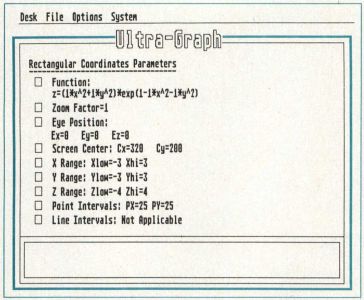 Demo Mode: Cycles through each of the coordinate systems and graphs one of the predefined functions for each. The only way out of the demo is to hit the Escape key after the program is finished drawing a graph. Due to what we think is a bug in the GFA Compiler, Demo Mode currently exits to bombs in the compiled program, but the runtime version performs flawlessly.