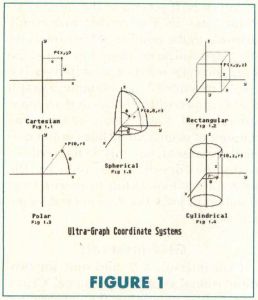 Ultra-Graph supports a total of five different coordinate systems for plotting equations. (See Figure 1). Cartesian and polar coordinate systems produce two-dimensional; rectangular, spherical and cylindrical coordinates systems are used for graphs in three-dimensional space. An almost infinite variety of shapes can be created by graphing various mathematical functions within these five coordinate systems.