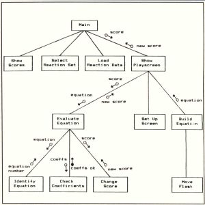 A "structure chart" is often used to depict the hierarchical connections among the modules in a system. A sample structure chart appears in Figure 1. As usual, this figure refers to the educational chemistry game, Reaction Time, that I wrote for the 8-bit Atari computers. Bits and pieces of Reaction Time have been scattered throughout the preceding articles in this series.