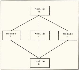 The lines connecting the modules on a structure chart indicate which higher-level module can call which lower-level (subordinate) modules. More often than not, a particular high-level module can call several subordinates, each of which performs a different function. On the other hand, multiple lines going to the same subordinate from several superordinate modules indicates that the subordinate can be invoked in several different ways, from different higher-level modules. Figure 2 shows that Module A has three subordinates, but Module E has three superordinates.