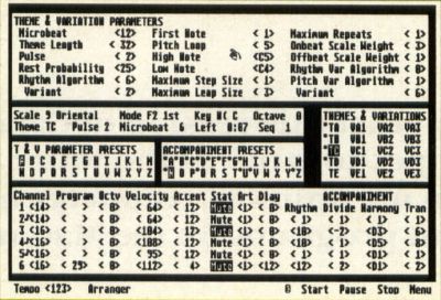 Musicians interested in computer-generated music should take a look at Dr. T's Tunesmith. Tunesmith's theme generator allows up to five themes with three variations on each to be generated and accessed at any time. Also, advanced rhythm algorithms permit the creation of rhythmically consistent themes.The melody parameters allow the creation of melodies that range from the mundane to the bizarre, and variation algorithms assist in the creation of alternate themes logically extrapolated from the original themes. Up to six voices of MIDI output are obtainable, with each voice independently adjustable for articulation, delay, MIDI channel, octave, dynamics and muting. Parallel harmonies, counter melodies, echos, arpeggios, straight rhythms, cross rhythms and accent doublings are some of the effects that can be created, while drum algorithms allow the creation of percussion that can be derived from, or completely independent of, the melody.
