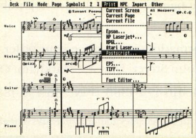 All Postscript printers are supported, as well as the Atari laser printer, HP Laser-jet Plus, HP plotters, and Epson FX- and HP Inkjet-compatible dot-matrix printers. Maximum score length is 100 pages.