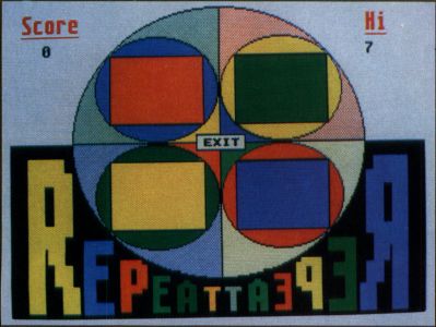 For older kids and adults, there's a memory game called Repeat. The computer will show a sequence of colored lights, and you must repeat it. The sequence will begin with one light, and continue to grow until you can't repeat it. Just click on a light to light it up. The highest score is saved to disk and displayed at the top of the screen to give you something to shoot for. Click on EXIT when you're done and ready to return to the cupboard.