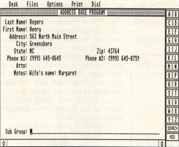 The program I chose, Address Base 0.9 by Steve MacMillan, provides all the essential elements found in an electronic address book. This medium-resolution program has the ability to load, save and merge files; add, edit and delete records and print the entered information.