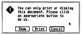 In addition to the runnable programs, some ARC files may also contain source code listings or an ASCII text file (called BREAKDWN.TXT, for example) which describes the program's structure. You can examine this file from the ST Desktop by double-clicking on its icon and then clicking on Show (to see it on the monitor) or Print (to print it out) as shown in the example below.