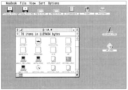 Program icons in NeoDesk can be placed directly on the Desktop. Say you have Word Writer buried deep within a folder labeled WP (for word processing). With NeoDesk ou can drag the Word Writer icon directly onto the Desktop and access it from there-no need to click through folder after folder. For even easier access, NeoDesk offers a "hot key" option much like CodeHead's Hot Wire through which programs appear with a simple press of a key.