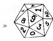 D20 is an icosahedron, with twenty sides numbered 1 to 20.