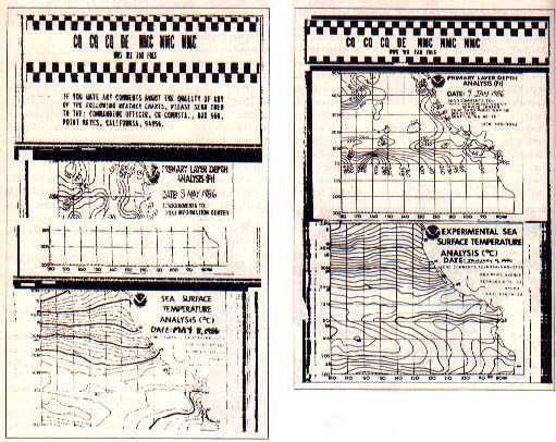 On the left is a typical WEFAX chart sequence received with our 8-bit WEFAX program. On the right is a similar chart produced by the National Weather Service.