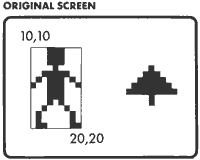 The idea of moving characters around the screen isn't much different from cutting and pasting paper shapes. First you must define a set of dots, then instruct the computer with a machine language routine to move all dots between, for example, screen coordinates 10,10 and 20,20.