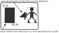 The only solution would be to write a complicated machine language routine to store the picture we're cutting out before the shape messes it up, then restore it after the shape moves across the background. Since this must be done for each pixel in the "box," it can be very complicated.